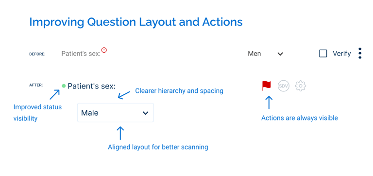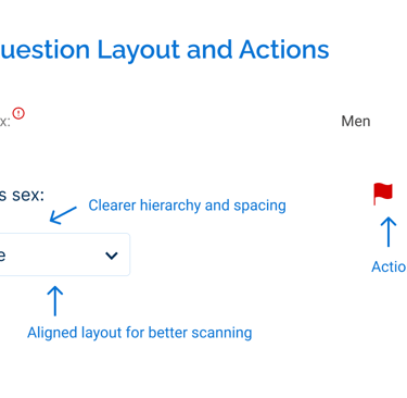 As part of the redesign, existing components were reworked to improve usability. For example, the question component was redesigned to make key information and actions more visible, replacing hidden interactions with persistent elements and improving layout consistency.
