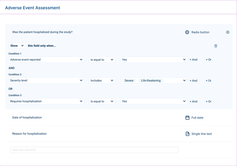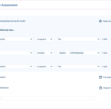 To address this, logic was structured into simple, predictable interactions that make conditions and relationships easier to define. The system also supports flexible study configurations, including dynamic forms, unscheduled events, and evolving setups, without overwhelming users.