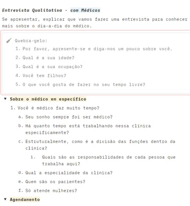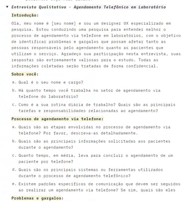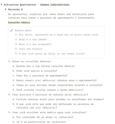 Montamos questionários específicos para falarmos com pacientes, funcionários e médicos, e fomos até uma das unidades do cliente. Após, transcrevemos as entrevistas e analisamos os dados coletados, destacando informações importantes, problemas apresentados e supostas soluções.