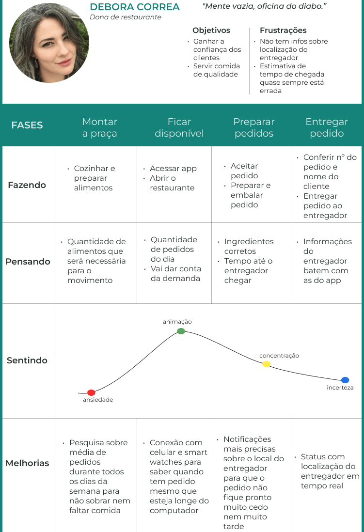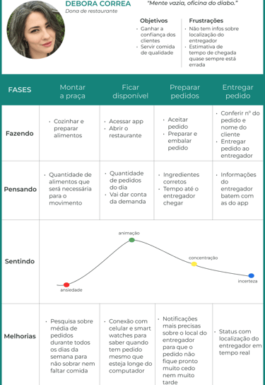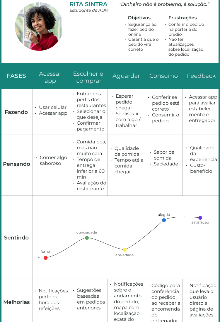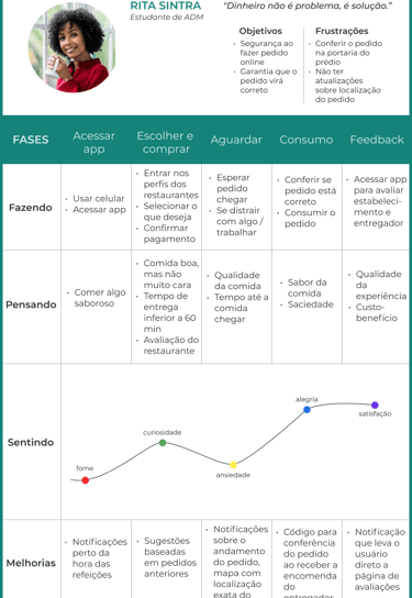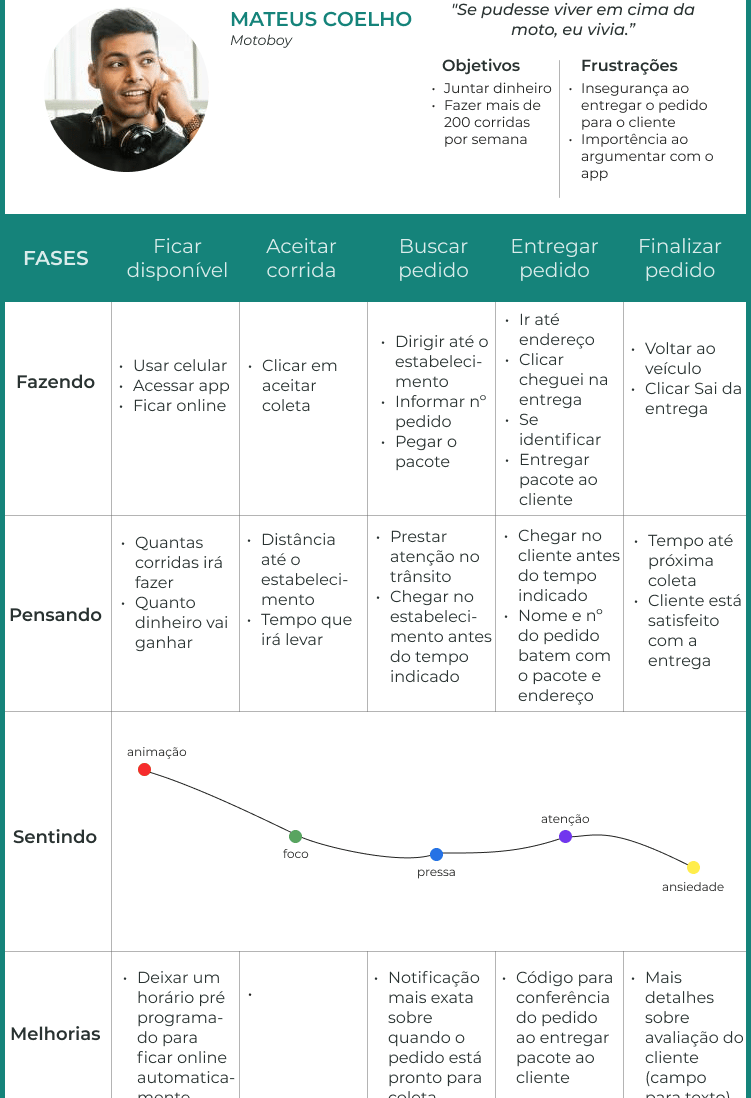 A partir das informações coletadas durante a Fase 2, juntei e classifiquei pontos em comum citados pelos entrevistados, identificando possíveis melhorias, e criei três personas e suas respectivas jornadas para representar os três usuários do aplicativo. Com elas, posso entender melhor os objetivos e frustrações dos usuários.